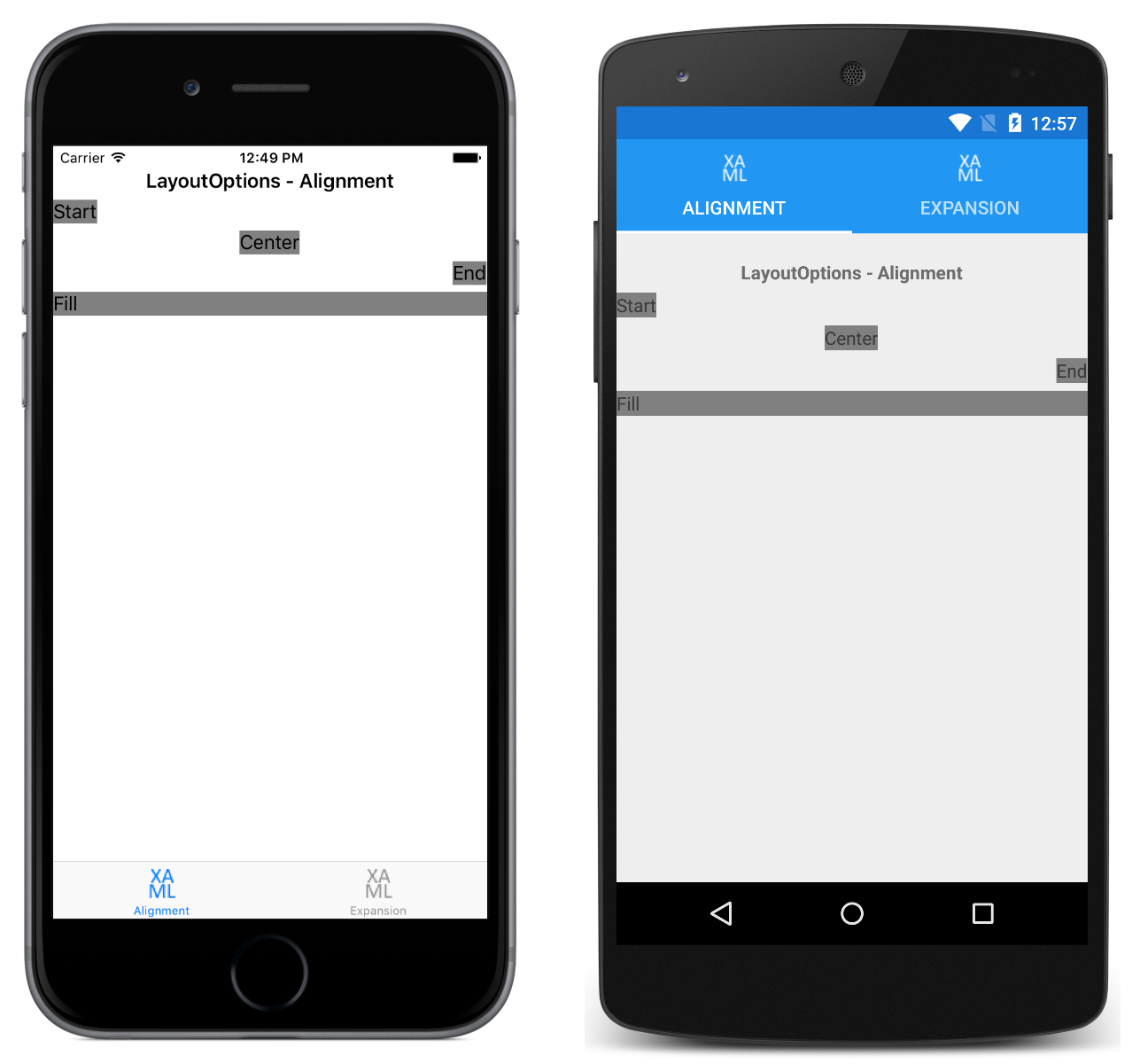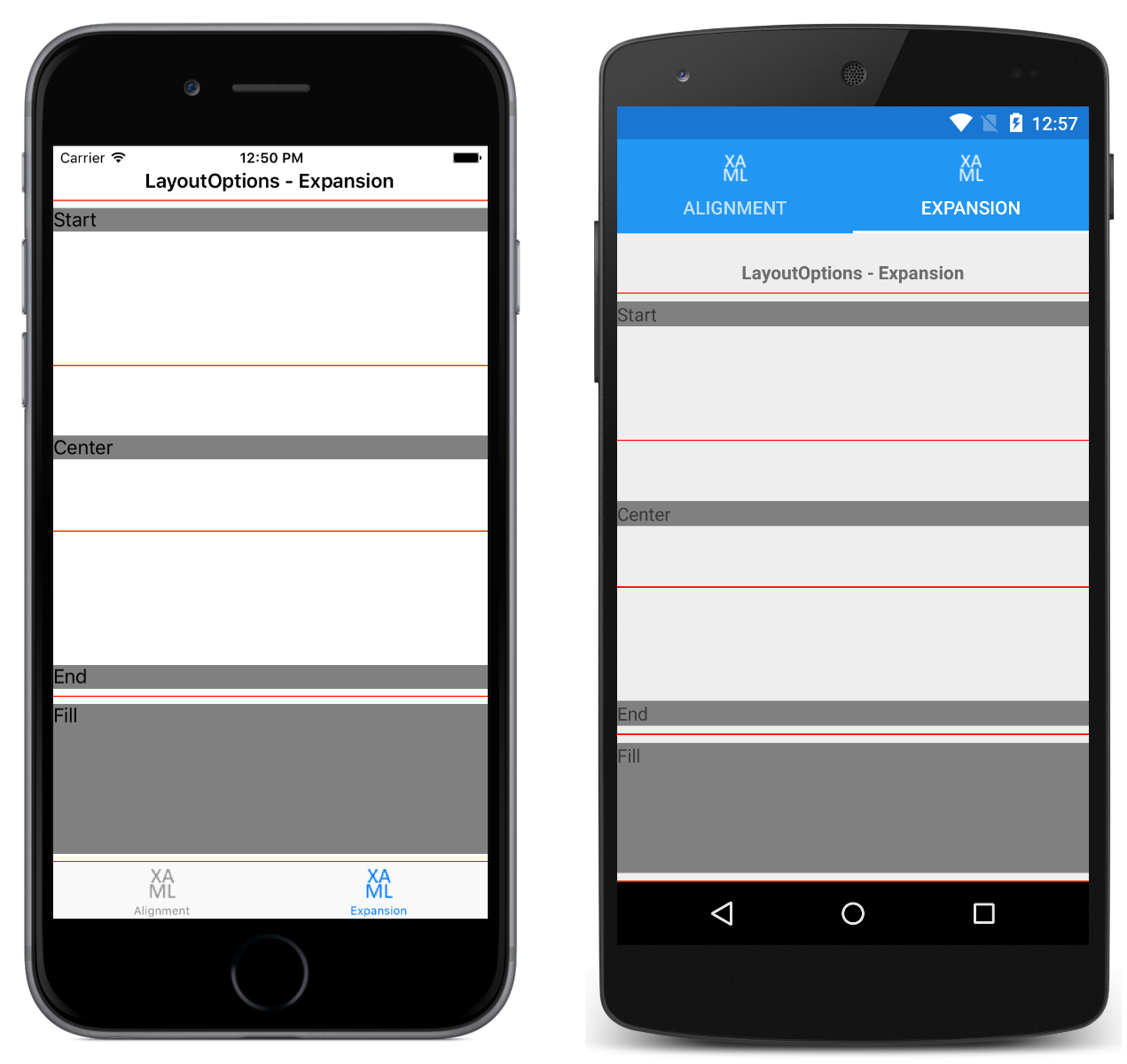 Every Xamarin.Forms view has HorizontalOptions and VerticalOptions properties, of type LayoutOptions. This article explains the effect that each LayoutOptions value has on the alignment and expansion of a view.