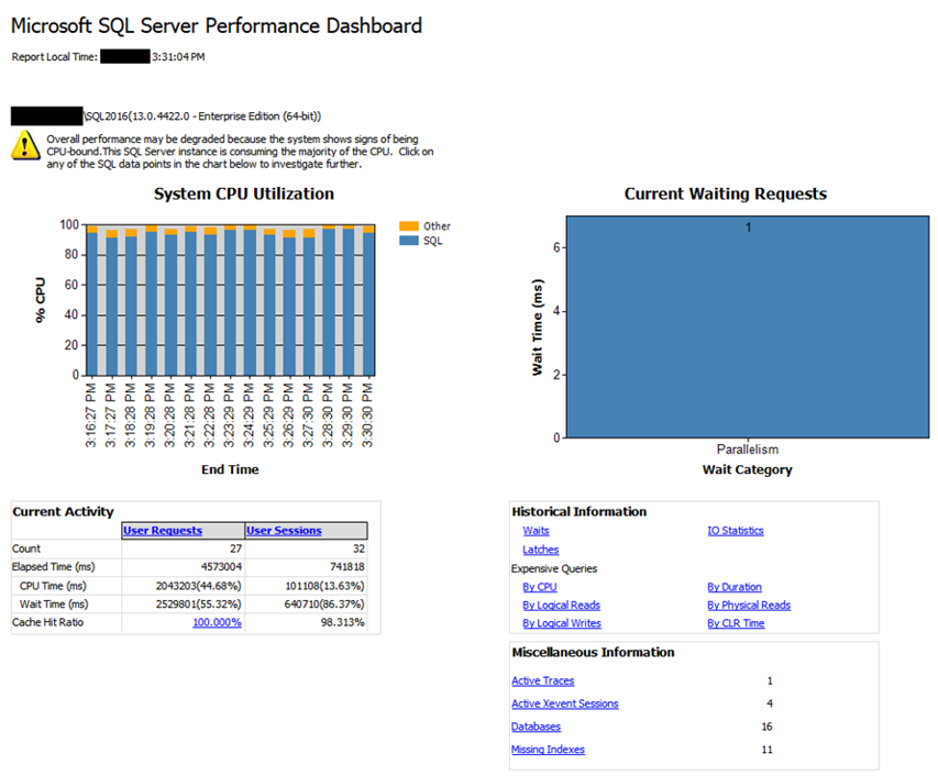 Prestandainstrumentpanelen hjälper dig att snabbt identifiera om SQL Server eller Azure SQL Database har en flaskhals med prestanda. Och om en flaskhals hittas kan du enkelt samla in extra diagnostikdata som kan vara nödvändiga för att lösa problemet. Några vanliga prestandaproblem som prestandainstrumentpanelen kan hjälpa dig att identifiera är: