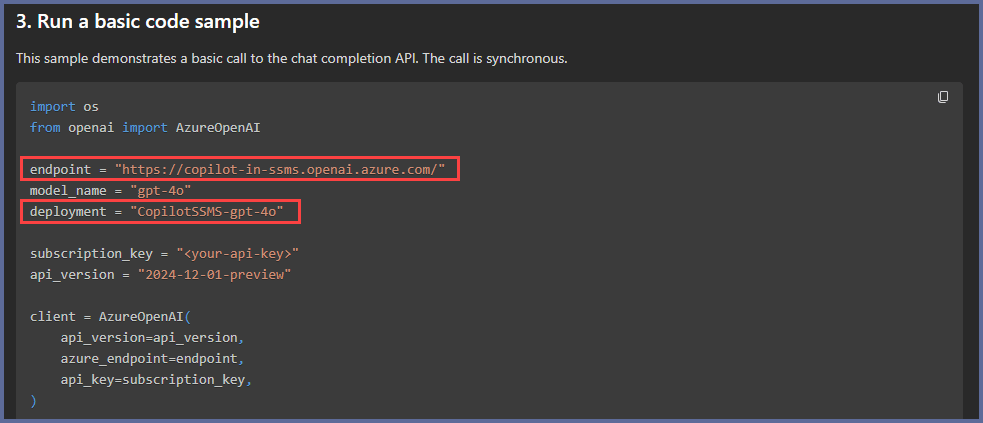 Copilot i SQL Server Management Studio (SSMS) använder en slutpunkt och distribution i Azure OpenAI. Den här artikeln innehåller stegen för att skapa nödvändiga Azure OpenAI-resurser. Mer information finns i Skapa och distribuera en Azure OpenAI i Azure AI Foundry Models-resurs.