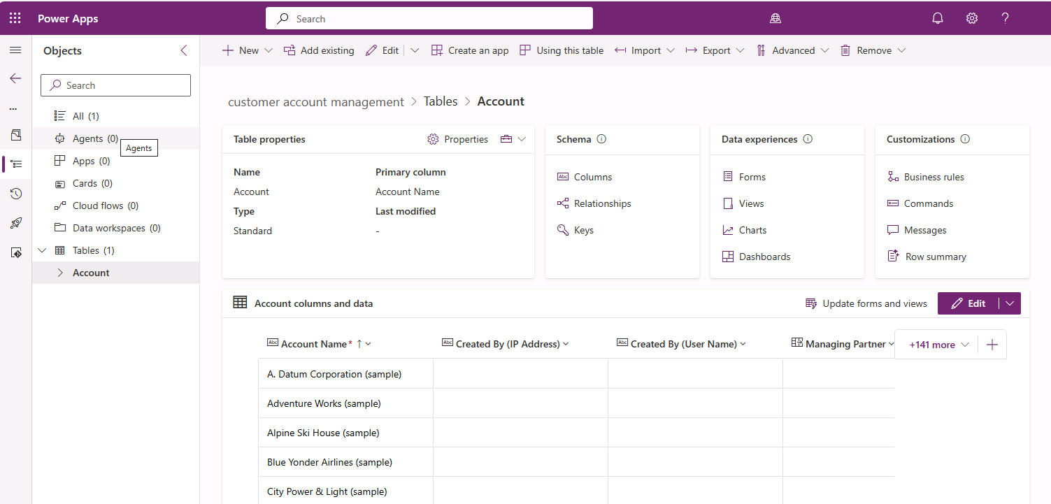 Goal: Integrate the Account table into your solution and prepare its components, such as forms and views, for use in your app.