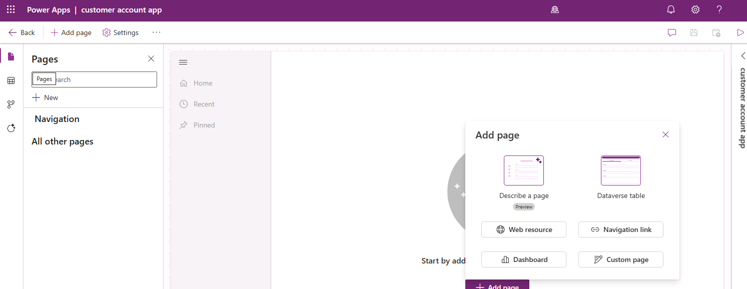 Enter a name for the app (for example, "Customer Account App") and select Create. The app designer opens.