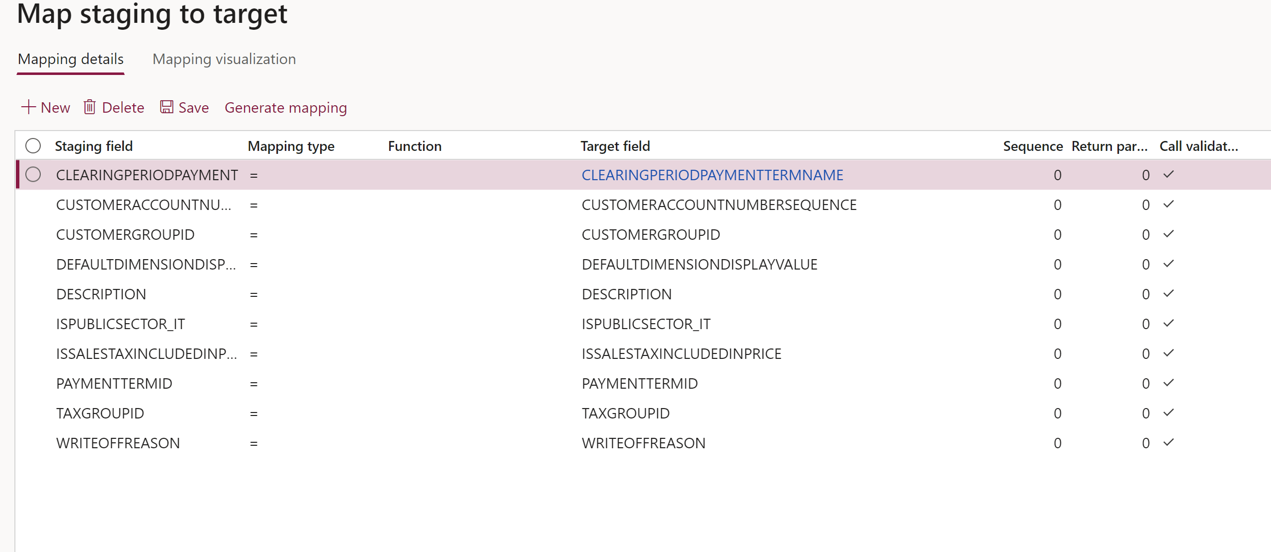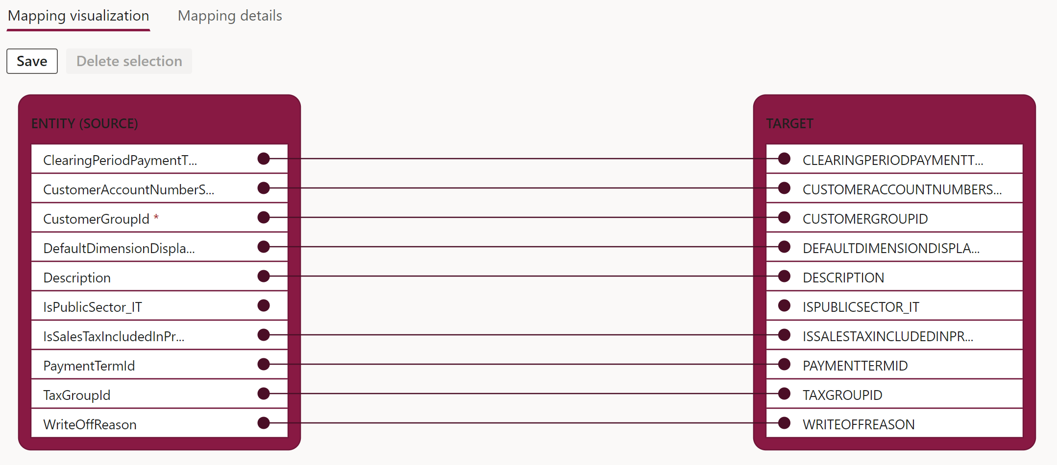 When a new Export or Import project is created in Data management, an icon will appear in the project line in the View map column. When you select this icon, the mapping visualization between the staging table and the external data source appears, as shown in the following screenshot. The Mapping details tab, next to the Mapping visualization tab, provides the source-to-target field mapping details and an option for basic transformation of the data.