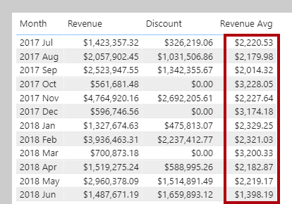 Observera att formeln använder VALUES DAX-funktionen. Den här funktionen låter dina formler avgöra vilka värden som finns i filterkontexten. I det här fallet AVERAGEX itererar funktionen över varje försäljningsorder i filterkontext. Det innebär att den upprepas för varje försäljningsorder för månaden. Filterkontexten VALUES och funktionen introduceras i modulen filterkontext.