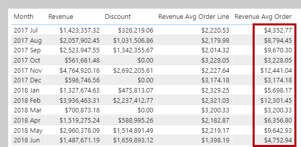 Som förväntat är den genomsnittliga intäkten för en order alltid högre än den genomsnittliga intäkten för en enskild orderrad.