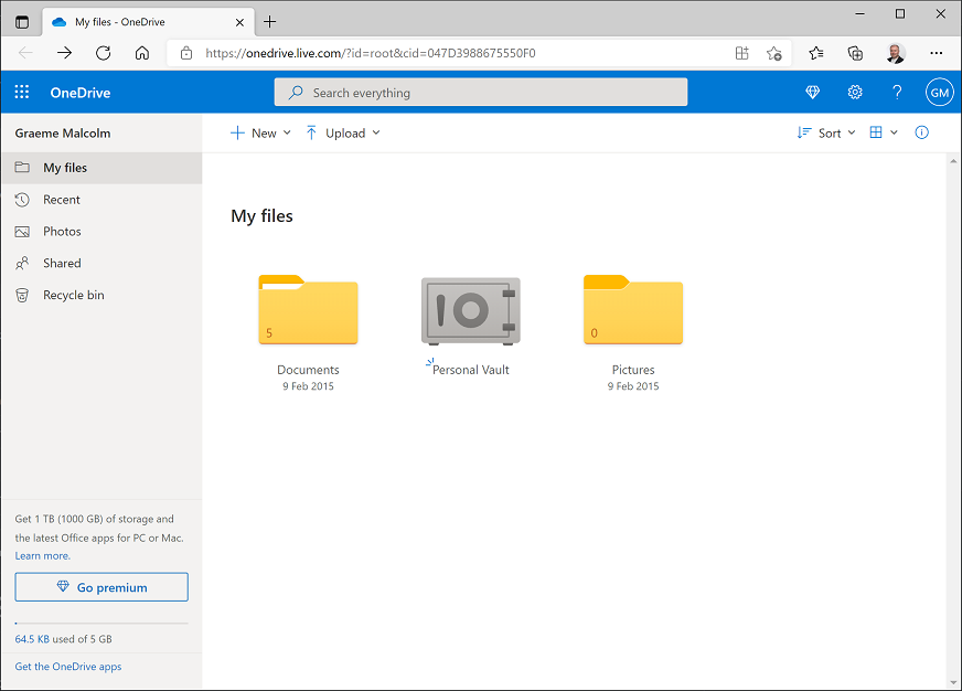 I webbläsaren navigerar du till https://onedrive.live.comoch loggar in med dina autentiseringsuppgifter för Microsoft-kontot. Du bör se filerna och mapparna i OneDrive, så här: