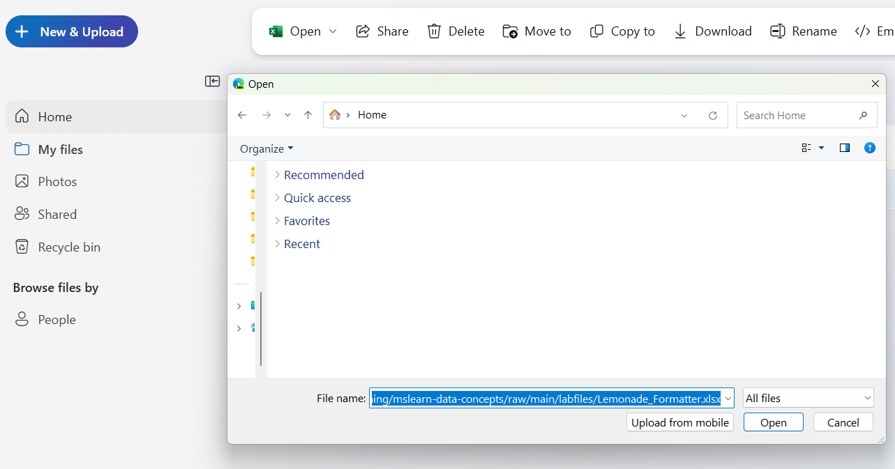 https://github.com/MicrosoftLearning/mslearn-data-concepts/raw/main/labfiles/Lemonade_formatted.xlsxKlicka sedan på Öppna för att ladda upp Excel-filen som innehåller Rosies lemonaddata, som du ser här: