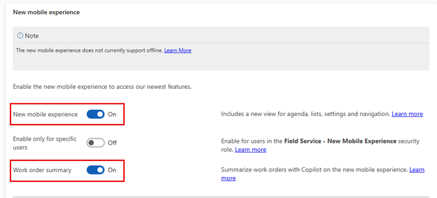 Configuration options for the refreshed mobile user experience are available in the Settings area of the Field Service mobile app module. To access these options, go to Mobile Settings > Features. In addition to activating the new mobile experience, we recommend that you turn on the Work Order Summary option for optimal functionality.
