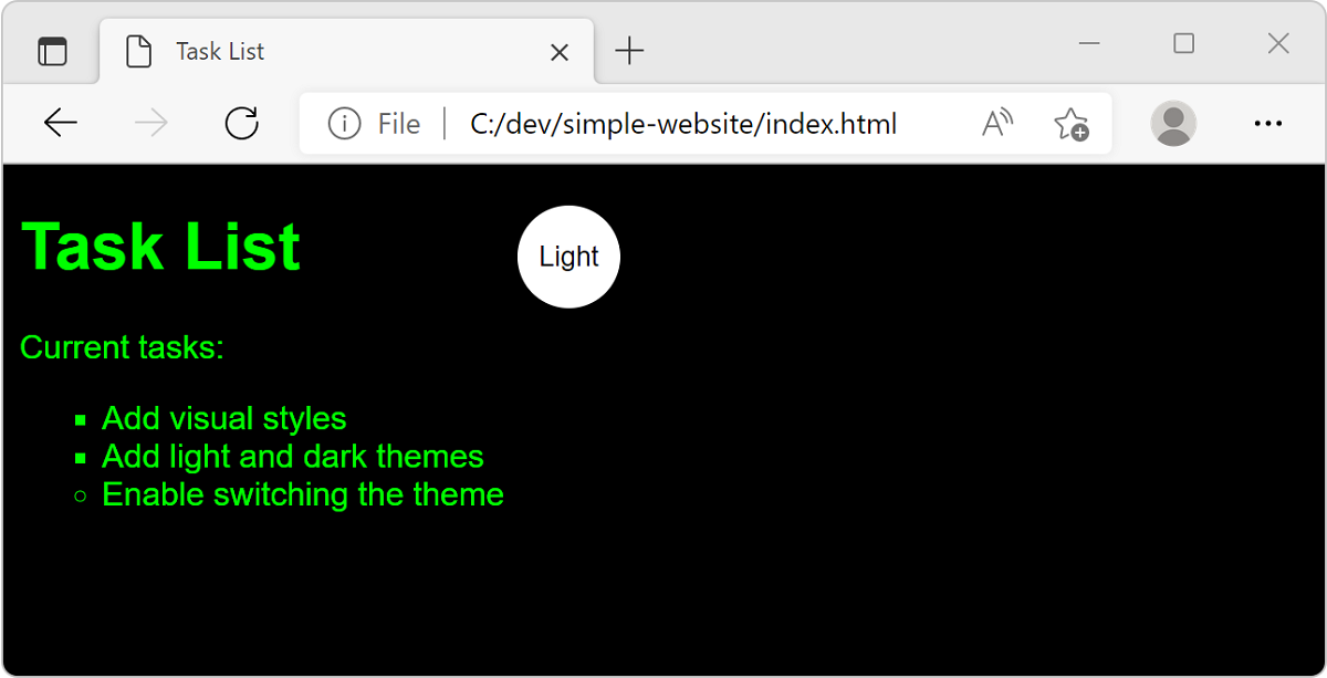 Anta att du är webbutvecklare och har blivit ombedd att göra företagets webbplats tilltalande för ett bredare utbud av kunder. För att dina kunder ska kunna anpassa sin upplevelse på din webbplats bestämmer du dig för att lägga till stöd för ljusa och mörka teman. Du skapar en liten webbplats för konceptbevis för att demonstrera stöd för teman med hjälp av CSS, och du skriver en JavaScript-funktion för att växla mellan dessa teman.