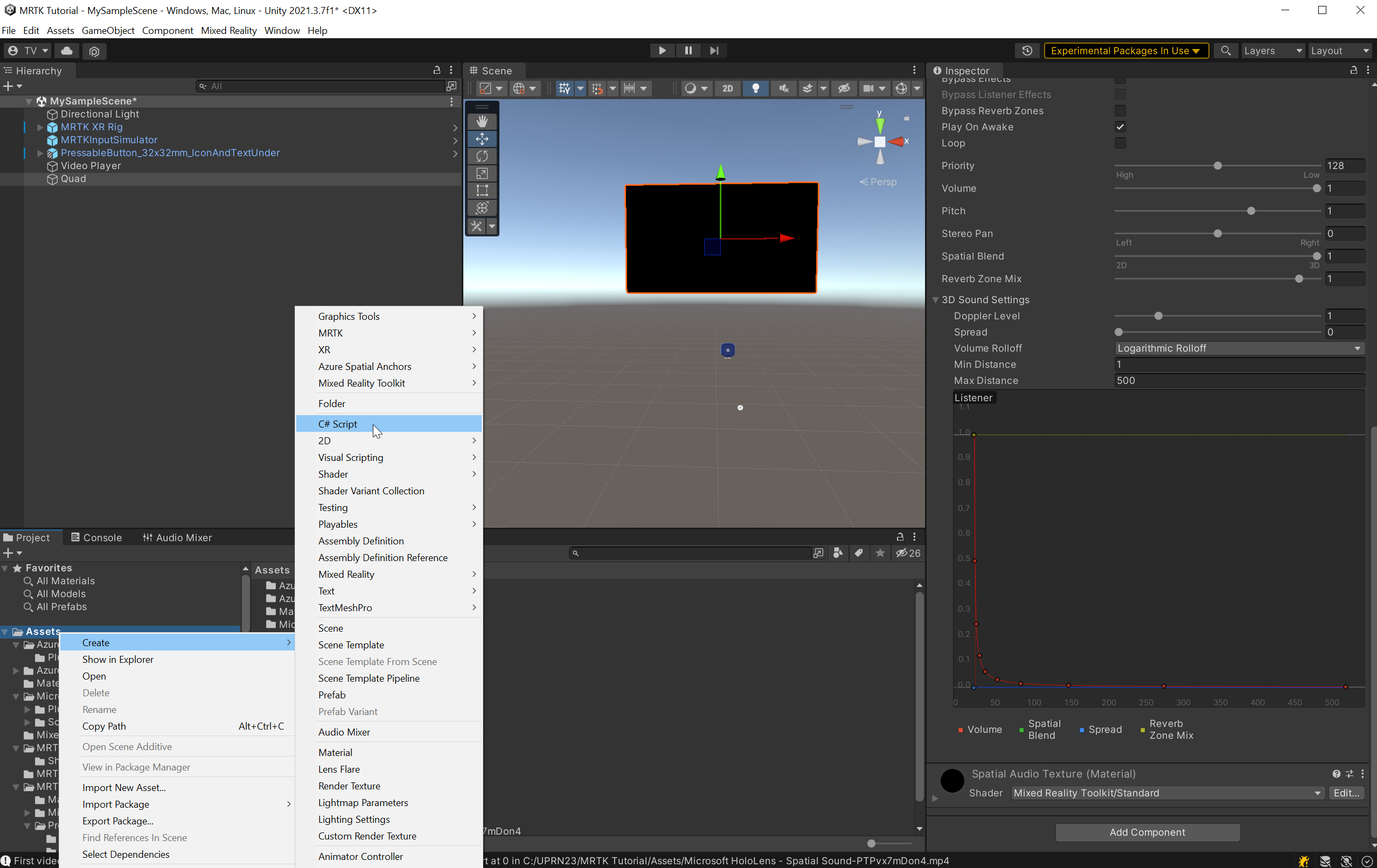 Högerklicka i projektfönstret och välj Skapa>C#-skript för att skapa ett nytt C#-skript. Ange ett lämpligt namn för skriptet. till exempel SpatializeOnOff.