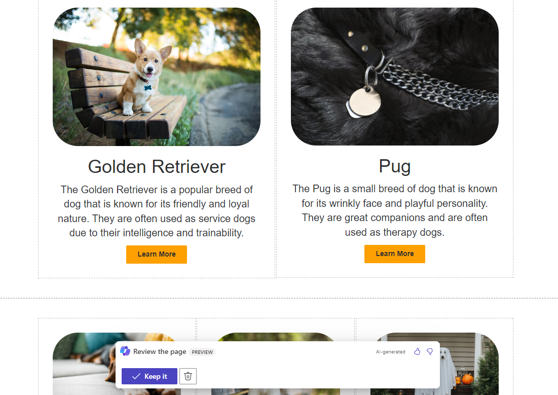 When you ask Copilot to create a new page or new section, it generates the page or section and gives you a preview. You can accept or reject the new page or section before Copilot applies it. Notice the images that appear may not match the text, so it's important to review. After you accept the new page or section, you can continue to edit by using standard functionality in Power Pages.