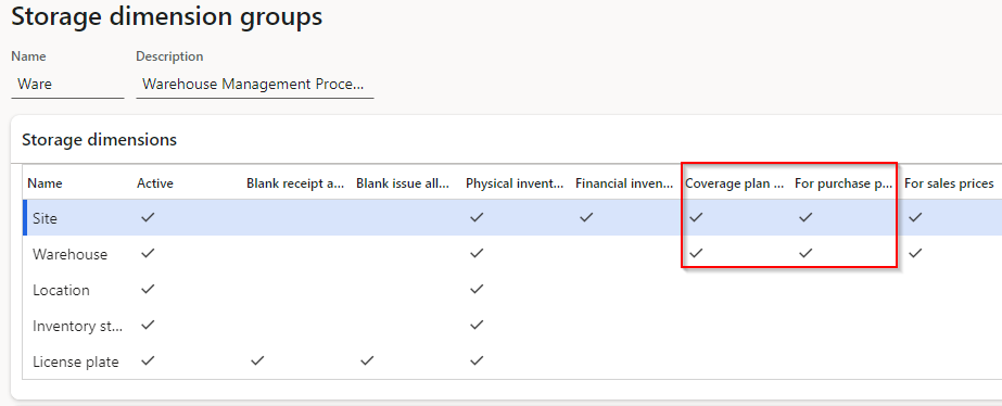 Go to Product information management > Setup > Dimension and variant groups > Storage dimension groups, and then select a storage dimension group that applies to products that master planning should evaluate purchase trade agreements for. Make sure that each relevant storage dimension in this group has a check mark in the For purchase prices column. Repeat this step for every other relevant storage dimension group.