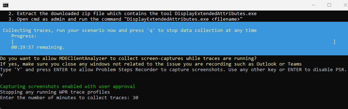 Vänta tills verktyget visar en blå banderoll enligt följande skärmbild. Banderollen visar meddelandet "Samla in spårningar, kör ditt scenario nu och tryck på "q" för att stoppa datainsamlingen när som helst."