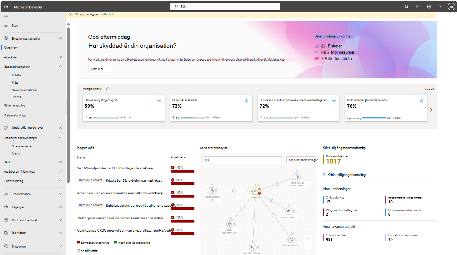 Följande bild visar översiktssidan för exponeringshantering i Defender-portalen: