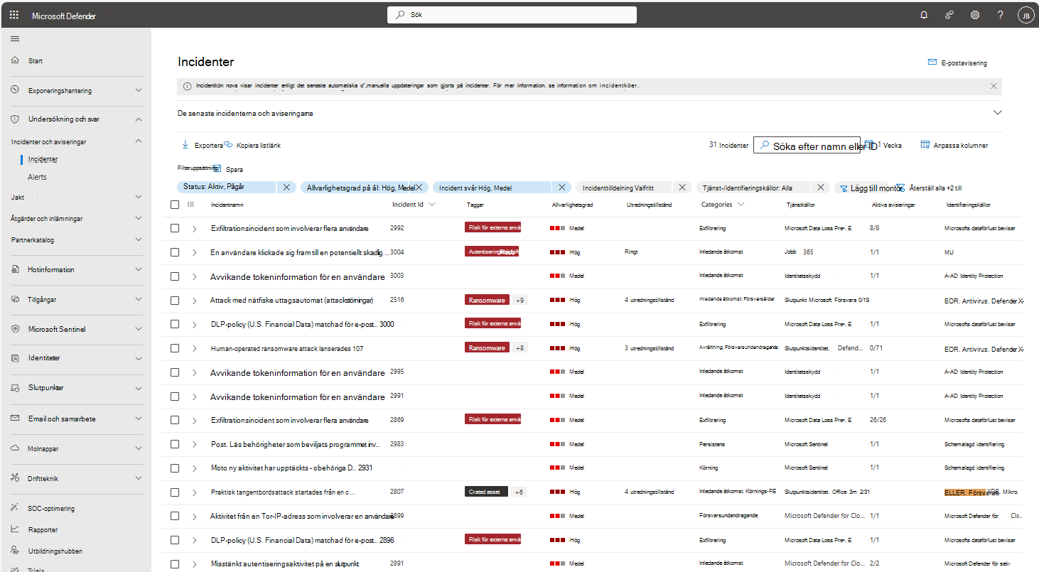 Följande bild visar den enhetliga incidentkön i Defender-portalen, med incidenter från flera tjänstkällor.