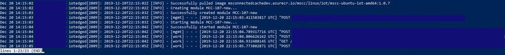 If it lists the edgeAgent and edgeHub containers, but doesn't include MCC, view the status of the IoT Edge security manager using the command: