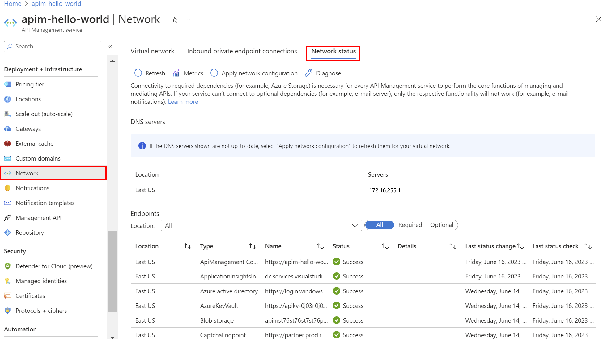 After deploying API Management into the subnet, use the portal to check the connectivity of your instance to dependencies, such as Azure Storage.