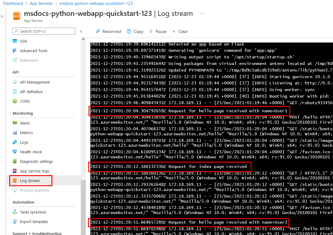 2021-12-23T02:15:52.740740222Z 169.254.130.1 - - [23/Dec/2021:02:15:52 +0000] "GET / HTTP/1.1" 200 1360 "https://msdocs-python-webapp-quickstart-123.azurewebsites.net/hello" "Mozilla/5.0 (Windows NT 10.0; Win64; x64; rv:95.0) Gecko/20100101 Firefox/95.0"