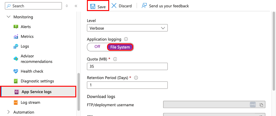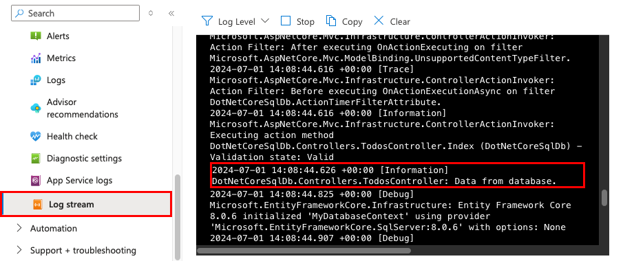 Azure App Service can capture console logs to help you diagnose issues with your application. For convenience, the AZD template already enabled logging to the local file system and is shipping the logs to a Log Analytics workspace.