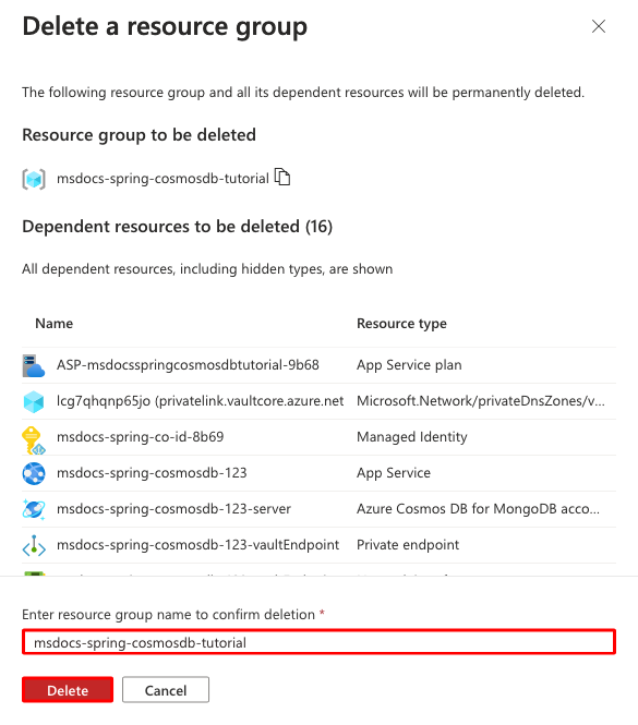 - In Resource Group, select msdocs-spring-cosmosdb-tutorial.