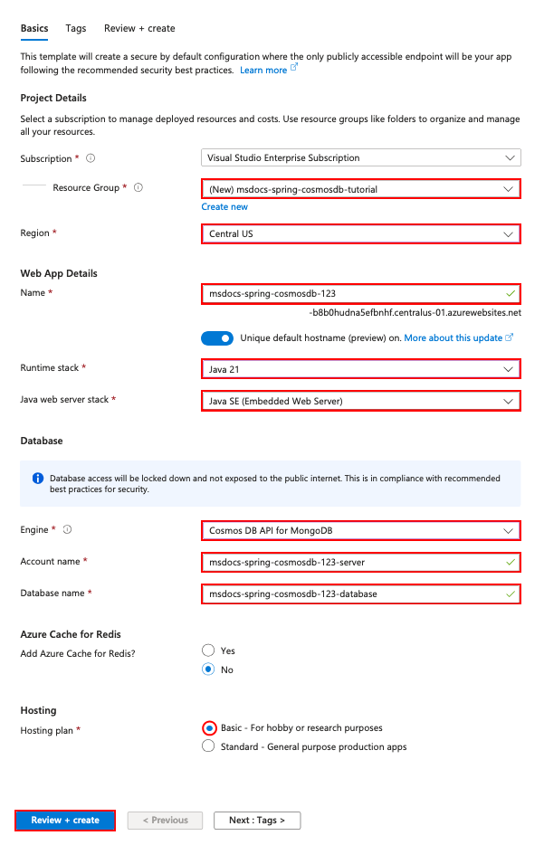- Hosting plan: Basic. When you're ready, you can scale up to a production pricing tier.