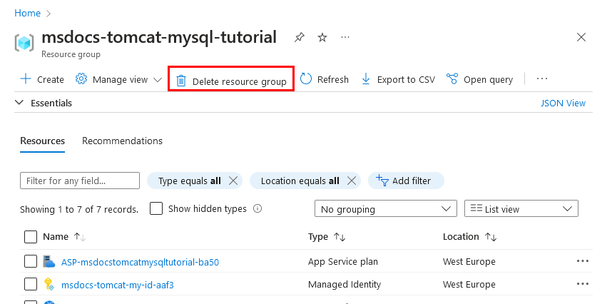 - In Resource Group, select msdocs-tomcat-mysql-tutorial.