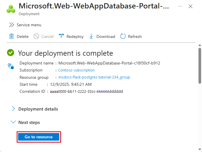 - In Resource Group, select msdocs-python-postgres-tutorial.
