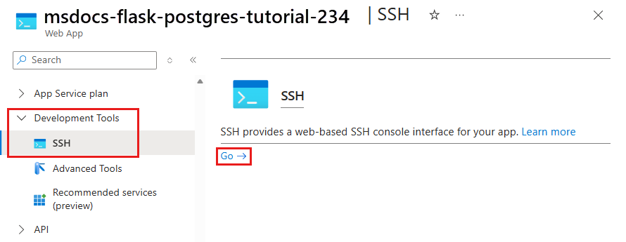 Open SSH session to App Service container at: <URL>In the SSH session, run