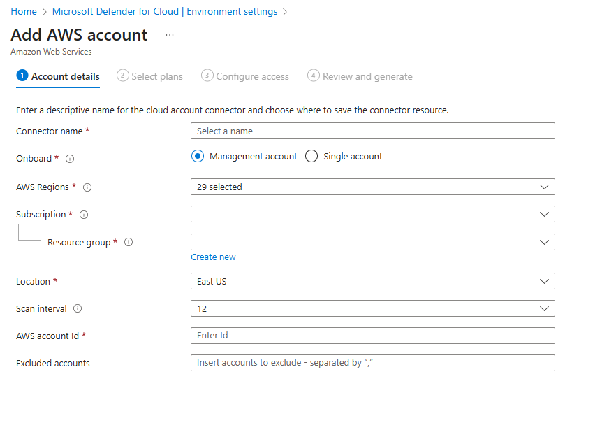 Enter the AWS account details, including the Azure region where the connector resource will be created.