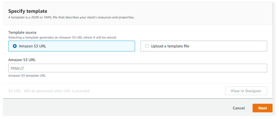 Amazon S3 URL: Upload the downloaded CloudFormation template to your own S3 bucket with your own security configurations. Provide the S3 URL in the AWS deployment wizard.