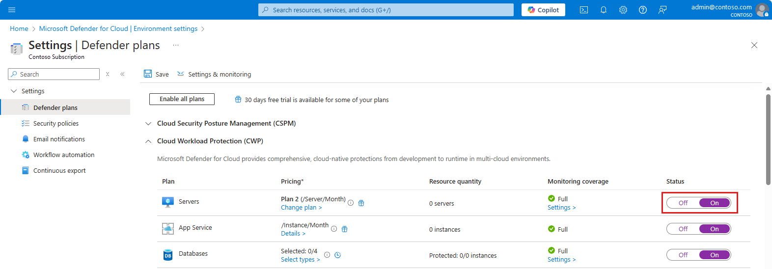 On the Defender plans page, toggle the Servers switch to On.