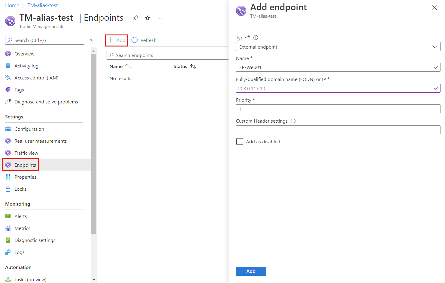 7. In the Endpoints page of TM-alias-test Traffic Manager profile, select + Add and enter or select the following information: