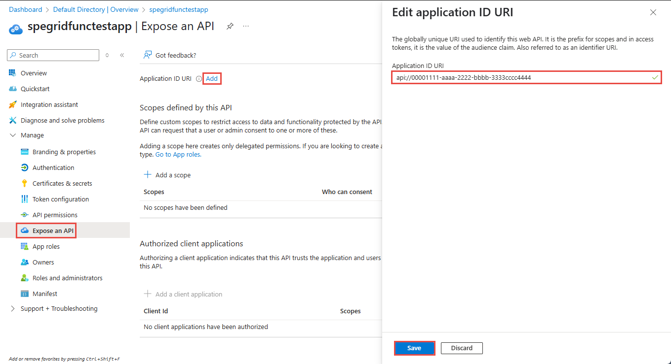 On the left menu, select Expose an API. Next to Application ID URI, select Add.