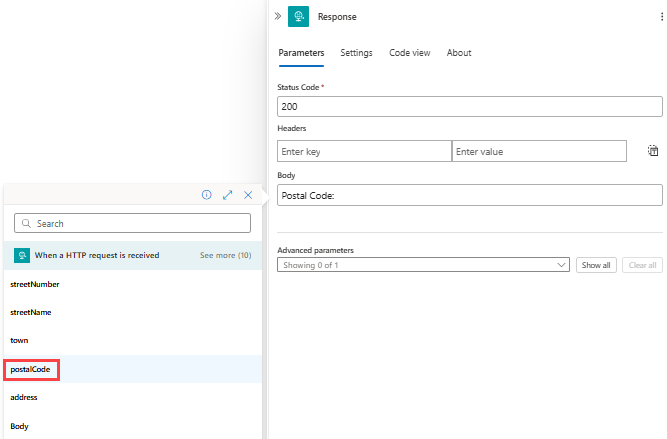 Postal Code:with a trailing space. Keep your cursor inside the edit box so that the dynamic content list remains open.Select the lightning icon to open the dynamic content list. From the When a HTTP request is received section, select the postalCode trigger output.