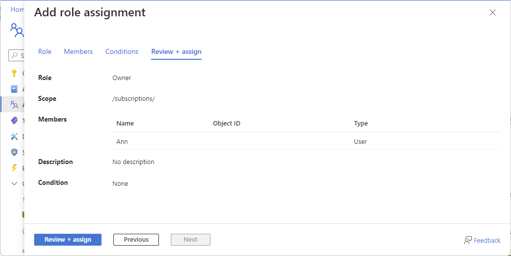 In the Add role assignment pane, review the role assignment.