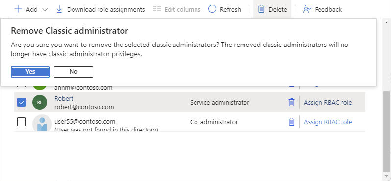 If Azure automatically assigns the Owner role, it doesn't automatically remove the classic administrator role assignment. You should remove this classic administrator role assignment. For steps on how to remove this role assignment, see remove Co-Administrator. If you don't want the Owner role assignment, you must remove both the Owner and Co-Administrator role assignments to remove access for the user.