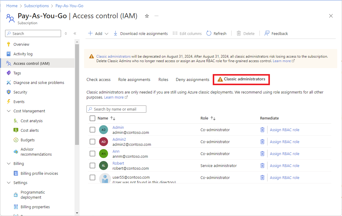 As of August 31, 2024, Azure classic administrator roles (along with Azure classic resources and Azure Service Manager) are retired and no longer supported. If you still have active Co-Administrator or Service Administrator role assignments, convert these role assignments to Azure RBAC immediately. Starting in December 2025, Azure will begin to automatically assign the Owner role at subscription scope to users in the public cloud who are still assigned the Co-Administrator or Service Administrator role.