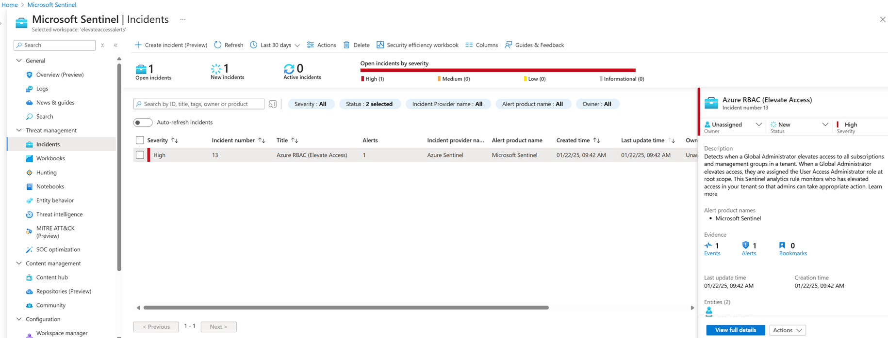 Use the Incidents page to view incidents of elevate access by following the steps at Navigate and investigate incidents in Microsoft Sentinel.