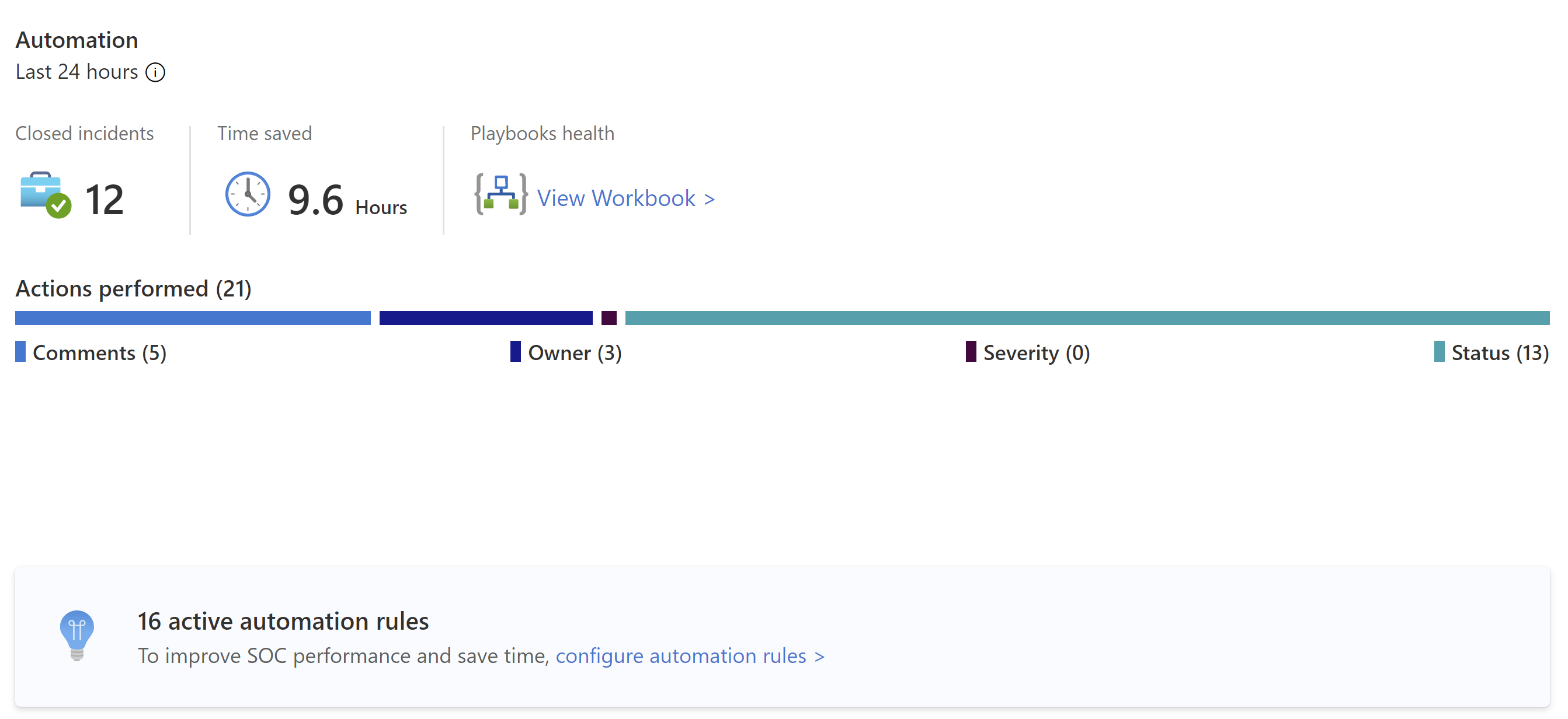 Start with a summary of the automation rules activity: Incidents closed by automation, the time the automation saved, and related playbooks health.