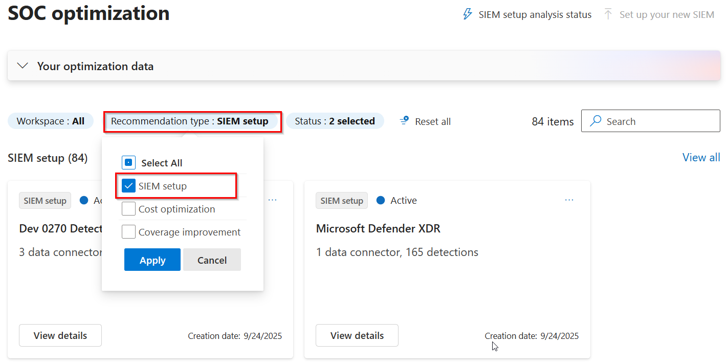 Filter recommendation type by SIEM Setup to see migration recommendations.