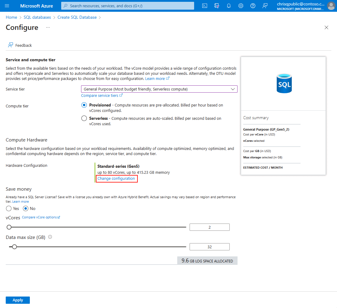 Provisioned compute - 5.1 GB per vCore - Provision up to 625 GB Serverless compute - Autoscale up to 24 GB per vCore - Autoscale up to 240 GB max |