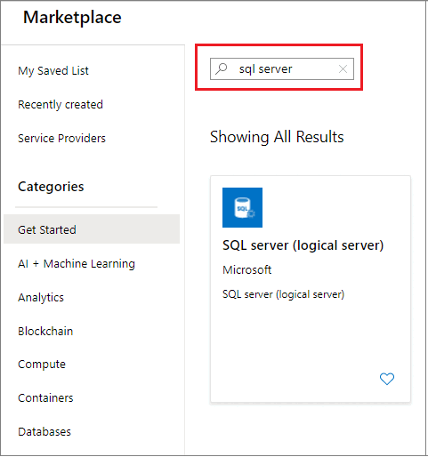 Screenshot of the Azure portal resource search for sql server showing SQL server logical server as the result.