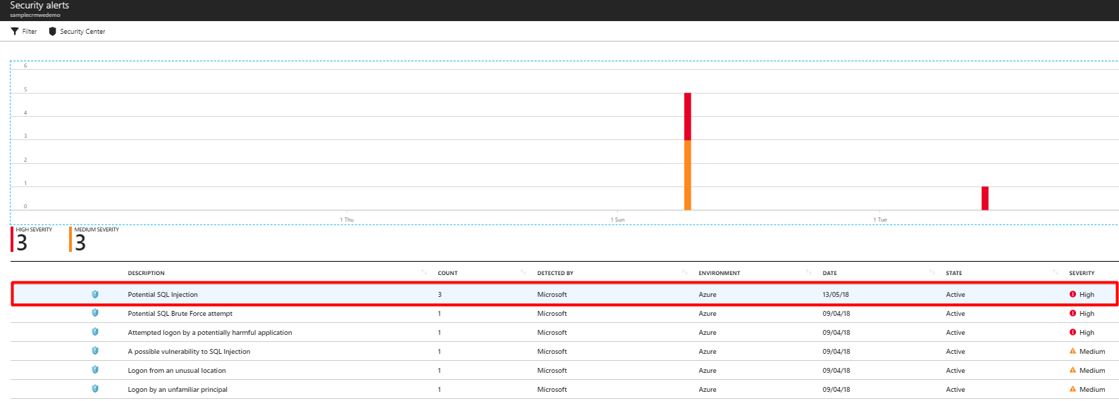 Select the View recent SQL alerts link in the email to launch the Azure portal and show the Microsoft Defender for Cloud alerts page. This page provides an overview of active threats detected on the database.