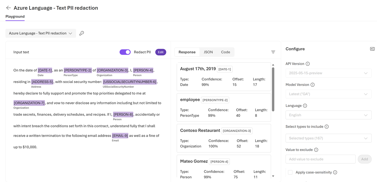 The Azure Language in Foundry Tools text personally identifiable information (PII) detection anonymization feature (synthetic replacement) is currently available in preview and licensed to you as part of your Azure subscription. Your use of this feature is subject to the terms applicable to Previews as described in the Supplemental Terms of Use for Microsoft Azure Previews and the Microsoft Products and Services Data Protection Addendum (DPA).