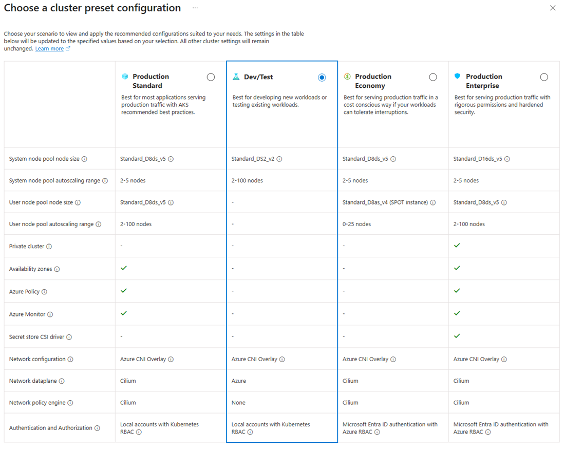 Cluster preset configuration: Select Dev/Test. For more details on preset configurations, see Cluster configuration presets in the Azure portal.