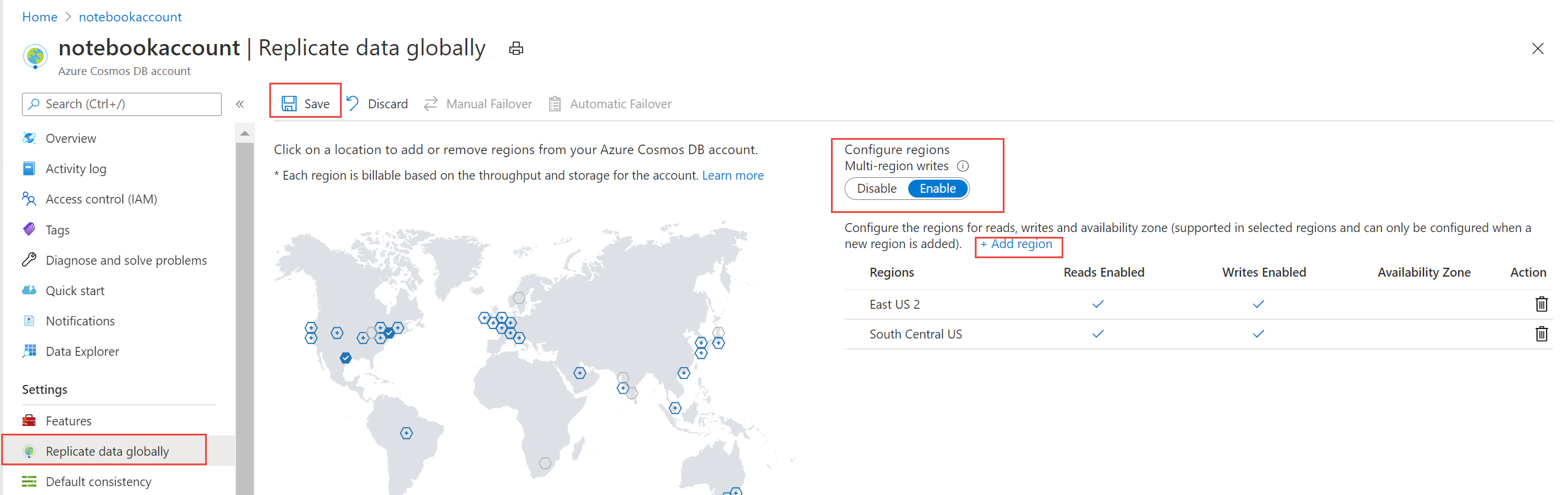 You can add more regions by selecting the icons on the map or by selecting the Add region button. All the regions you add have both read and writes enabled.