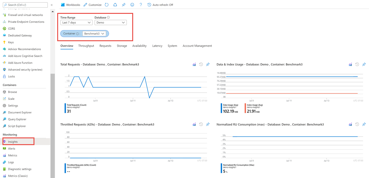 Open the Insights pane. By default, the Insights pane shows the throughput, requests, storage, availability, latency, system, and management operations metrics. The pane shows these metrics for every container in your account. You can select the Time Range, Database, and Container for which you want to view insights. The Overview tab shows RU/s usage, data usage, index usage, throttled requests, and normalized RU/s consumption for the selected database and container.
