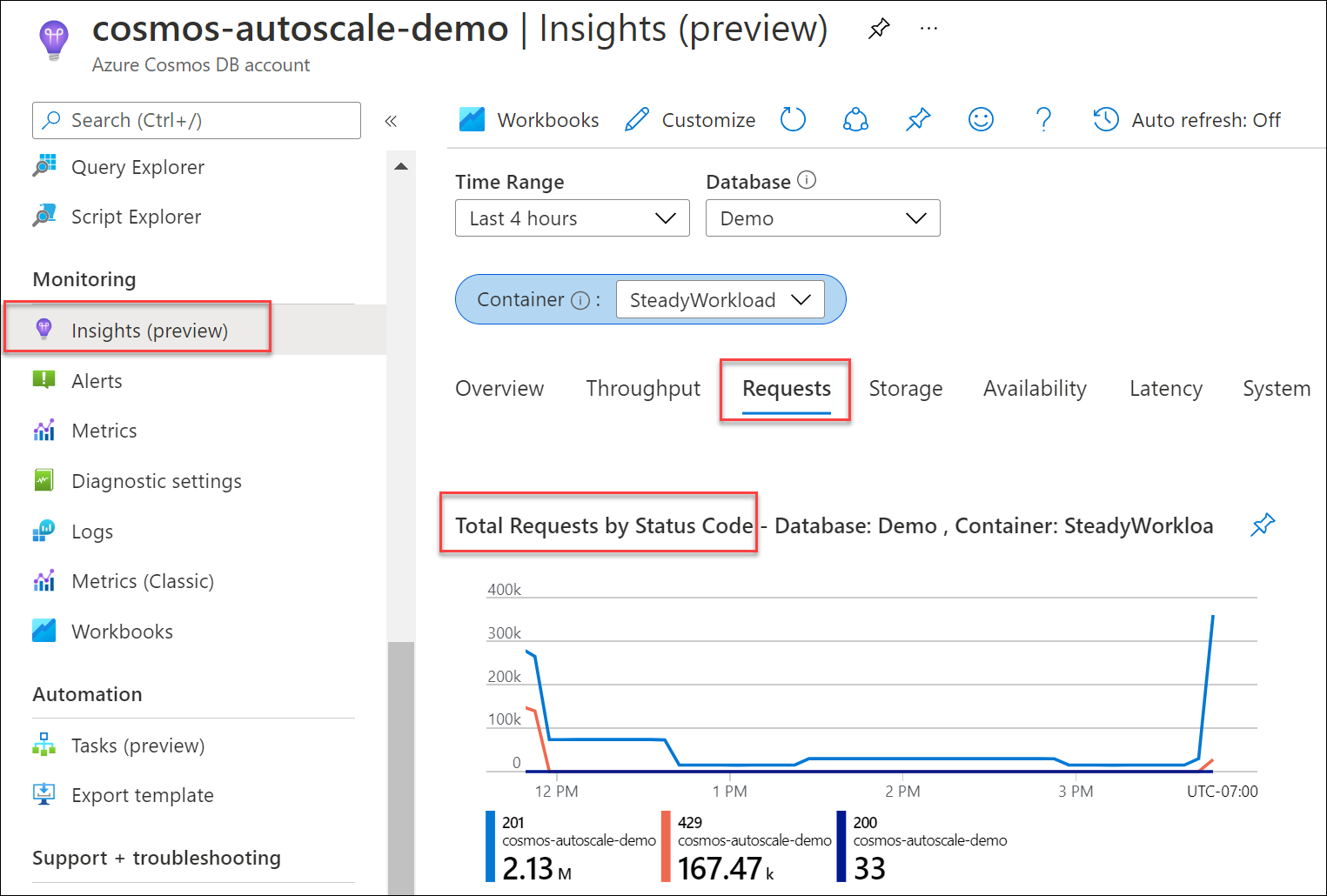 To determine what percent of your requests to your database or container resulted in 429s, from your Azure Cosmos DB account, navigate to Insights > Requests > Total Requests by Status Code. Filter to a specific database and container. For API for Gremlin, use the Gremlin Requests metric.