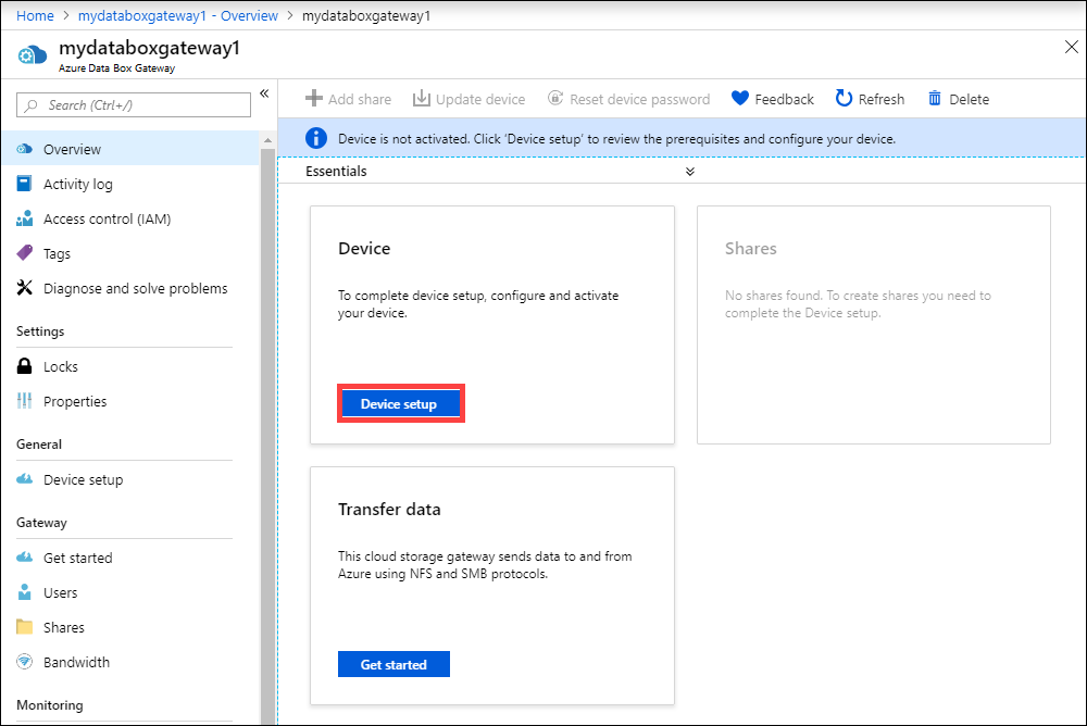 In the resource that you created and then select Overview. If you have an existing Azure Data Box Gateway resource, select the resource and go to Overview. Select Device setup.
