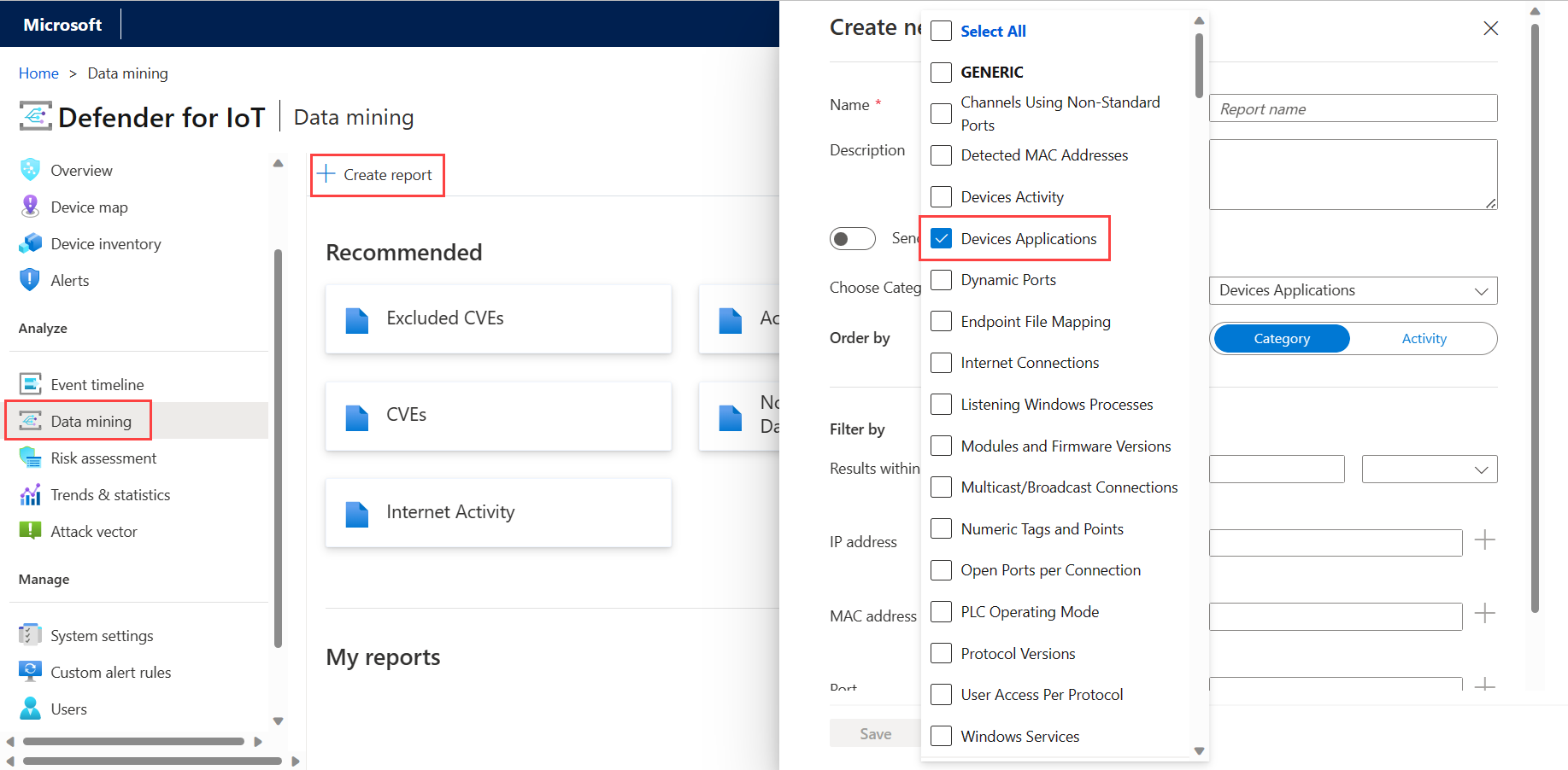 Select + Create report to create a custom report. In the Choose Category field, select Devices Applications. For example: