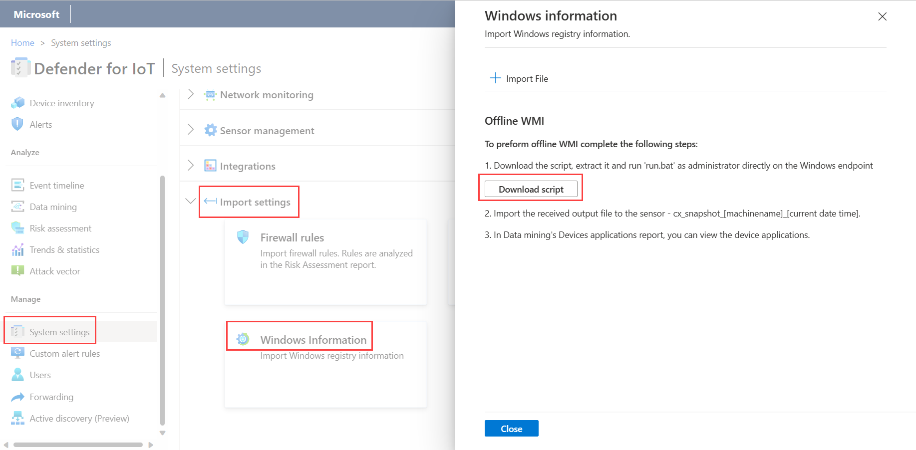 This article describes how to use a Defender for IoT Windows-based WMI tool to get extended information from Windows devices, such as workstations, servers, and more. Run the WMI script on your Windows devices to get extended information, increasing your device inventory and security coverage. While you can also use scheduled WMI scans to obtain this data, scripts can be run locally for regulated networks with waterfalls and one-way elements if WMI connectivity isn't possible.